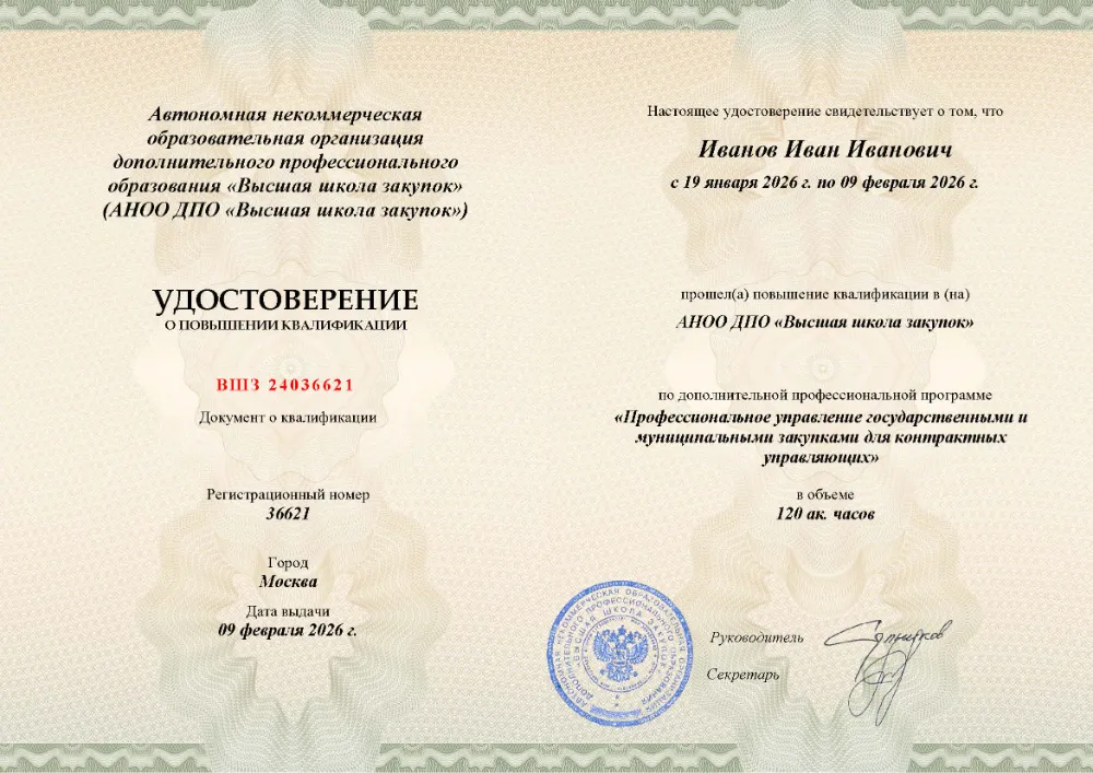 Вы получаете официальное удостоверение о повышении квалификации. Высшая школа закупок (fz44.org) обеспечивает передачу данных в реестр ФИС ФРДО, подтверждая соответствие вашей подготовки в Омске требованиям Минтруда.